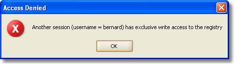 To avoid this situation, you can acquire an exclusive write access to the IceGrid registry with File > Acquire Exclusive Write Access. After this exclusive write access is granted, any attempt by another session to save to the IceGrid registry will result in an error: