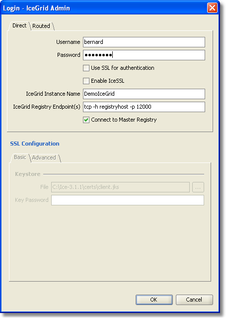 Select the Direct tab to connect directly to the IceGrid registry, that is, without going through an intermediary Glacier2 router. This is the most common type of login.