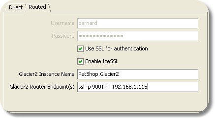 Select the Routed tab to connect to an IceGrid registry through a Glacier2 router. The fields are similar to the fields in the Direct tab, but an important difference: the target is a Glacier2 router, not an IceGrid registry.