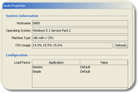 On Windows, shows the percentage of CPU utilization in the past 1, 5, and 15 minutes. On Linux/Unix, shows the load-average in the past 1, 5 and 15 minutes. These values are retrieved when the Node Properties panel is displayed. Click on the Refresh button to retrieve the latest values.